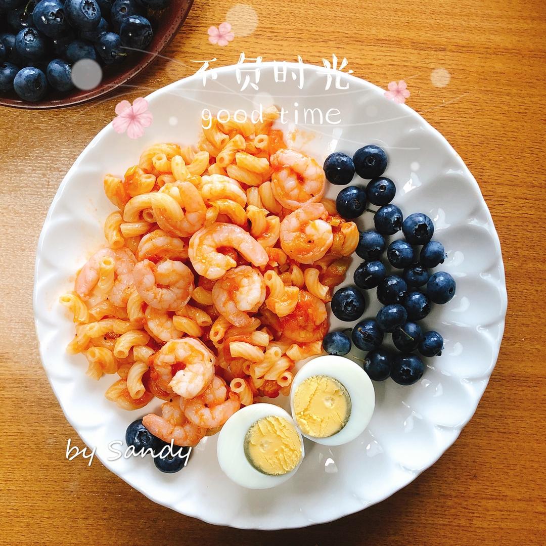 虾仁意面,煮鸡蛋,蓝莓