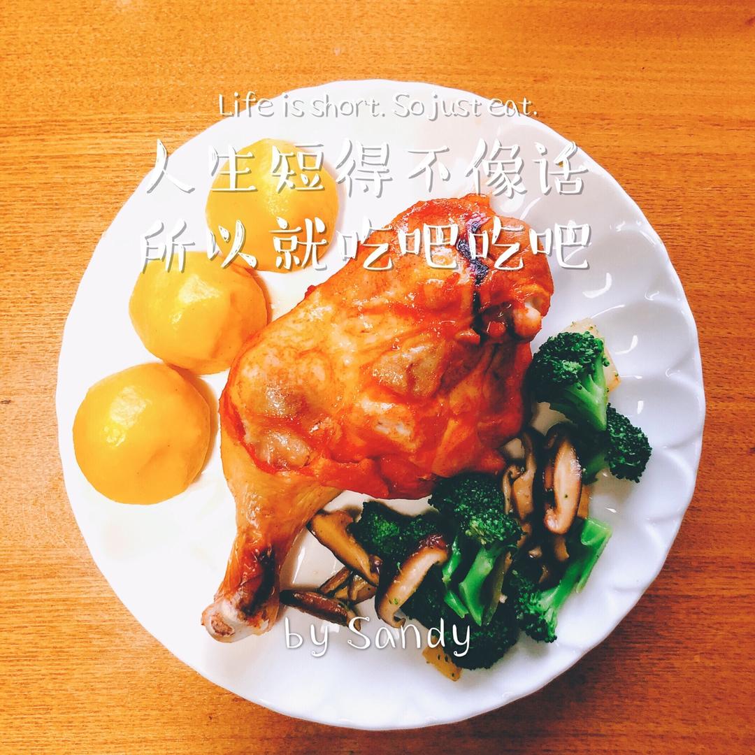 烤鸡腿,窝窝头,香菇洋葱炒西兰花