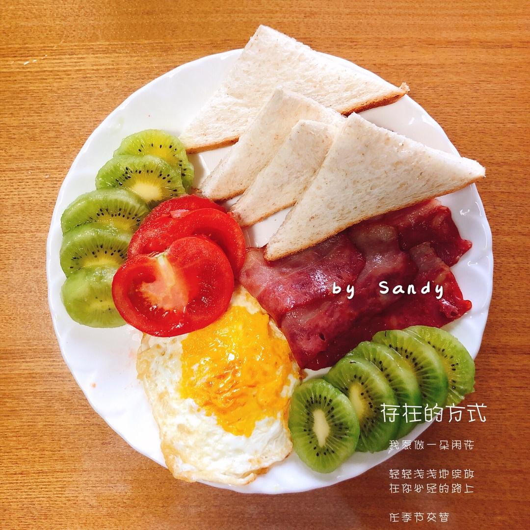 煎培根和鸡蛋,猕猴桃,全麦面包,西红柿