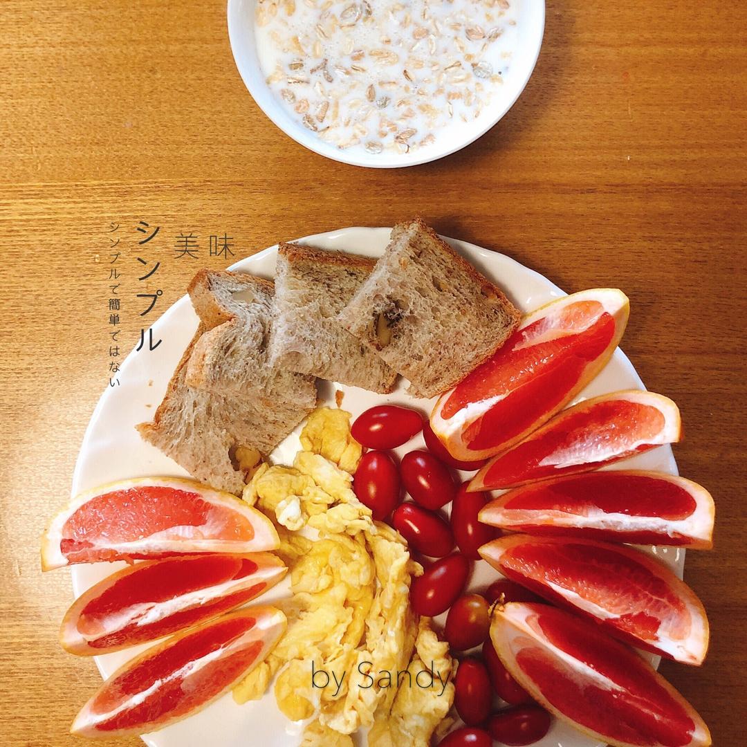 全麦面包,清炒鸡蛋,圣女果,葡萄柚,牛奶麦片