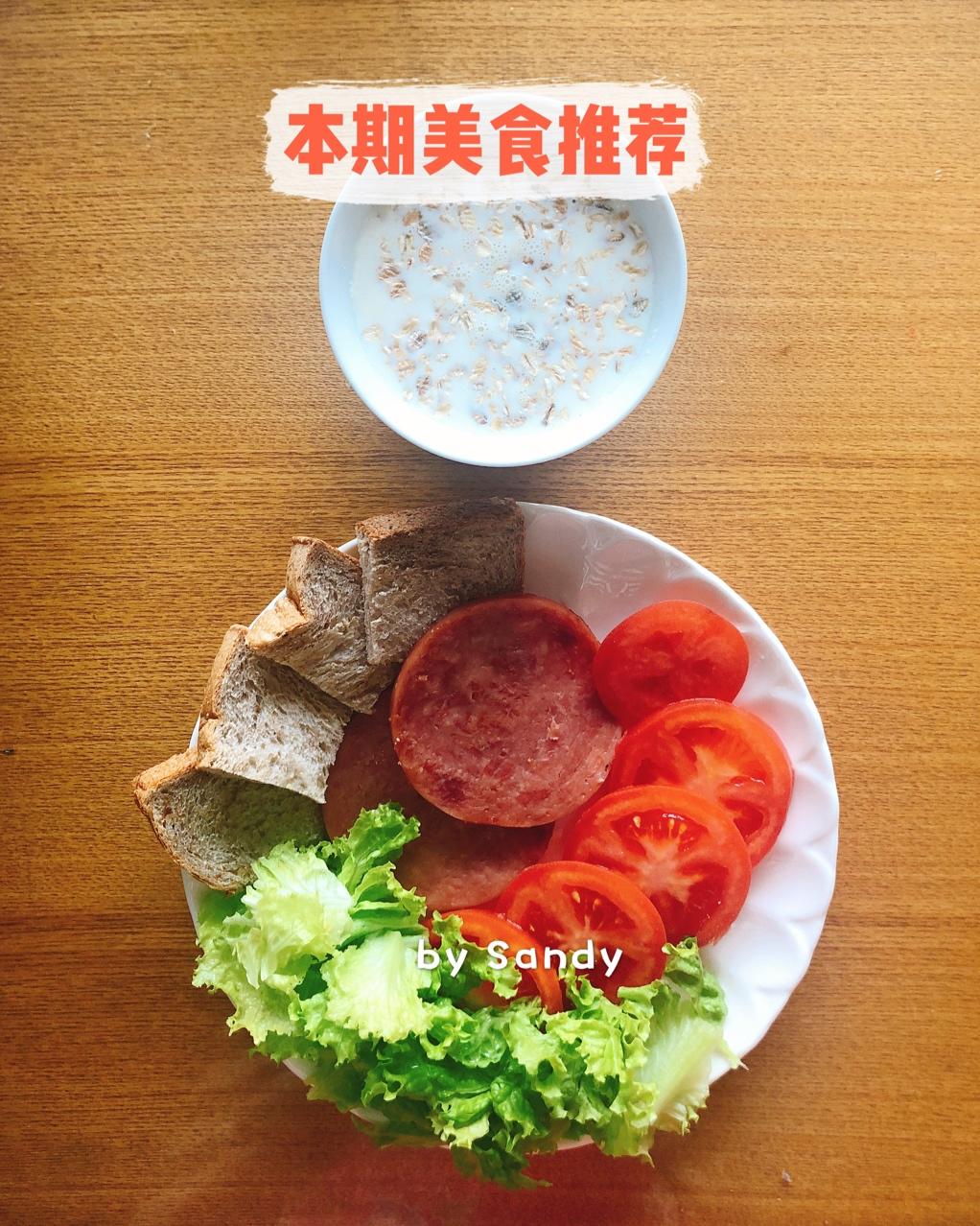 牛奶燕麦片,西红柿,生菜,煎火腿,全麦面包