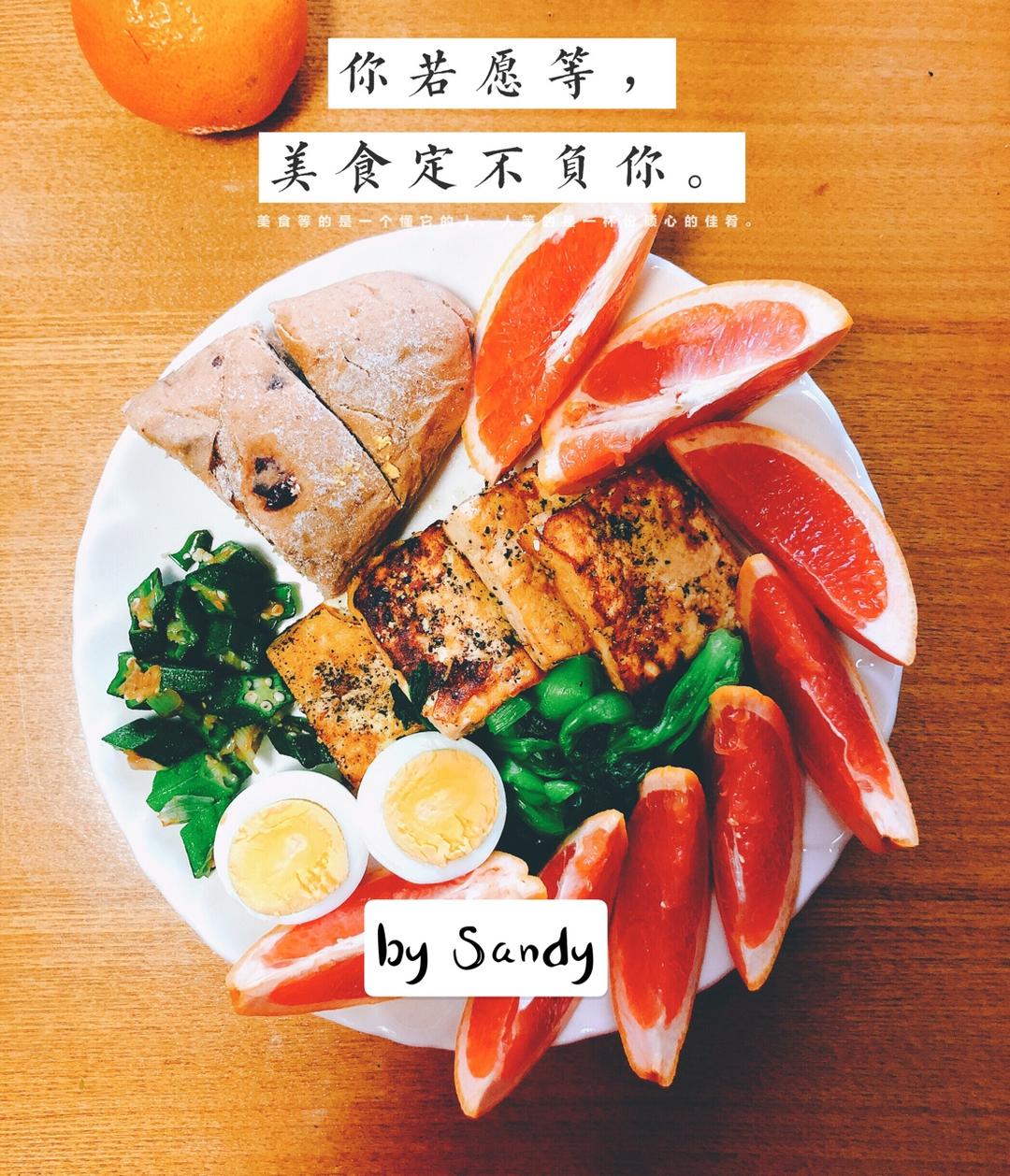 全麦面包,煮鸡蛋,炒秋葵,水煮油菜,煎豆腐,西柚