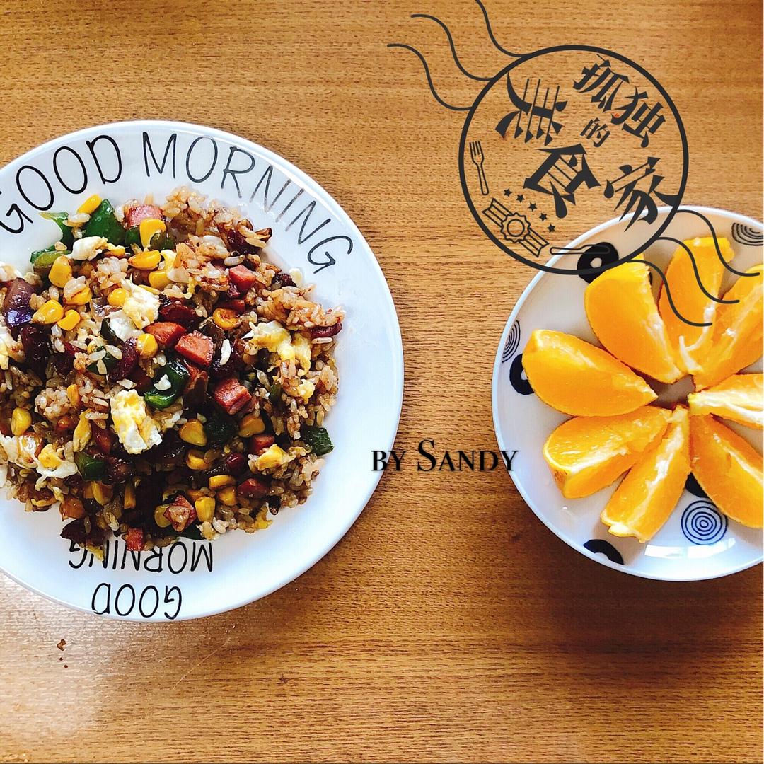 炒饭:鸡蛋,玉米粒,腊肠,橄榄油,酱油,青椒,洋葱。爱媛橙。