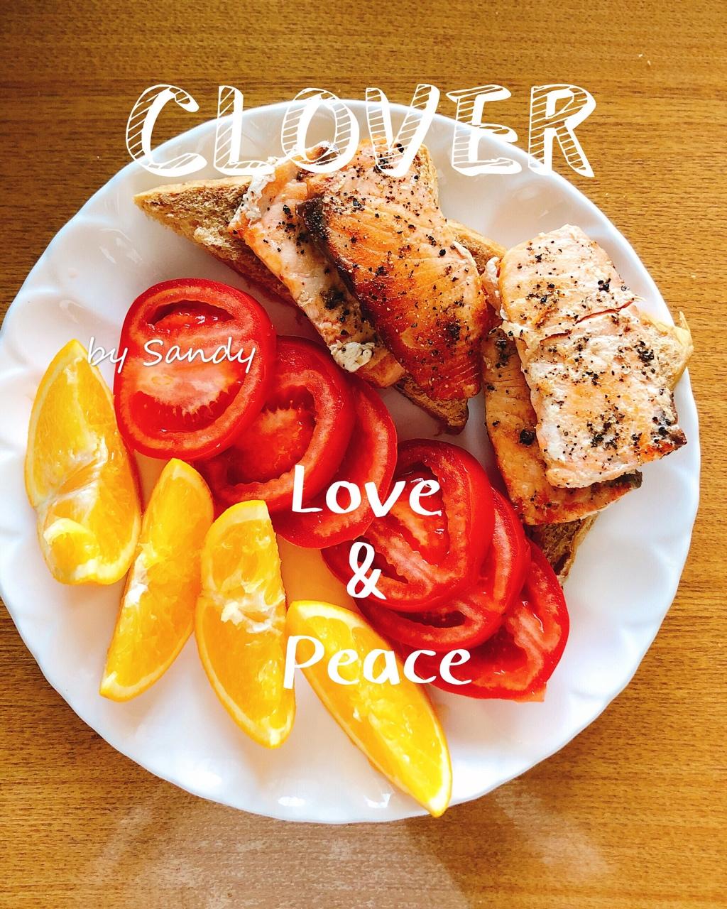 煎三文鱼,全麦面包,西红柿,橙