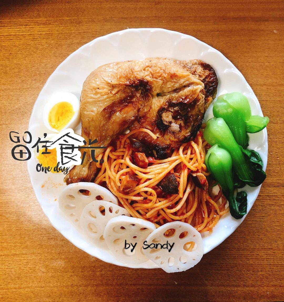 烤鸡腿,番茄香菇炒意面,水煮油菜和藕片
