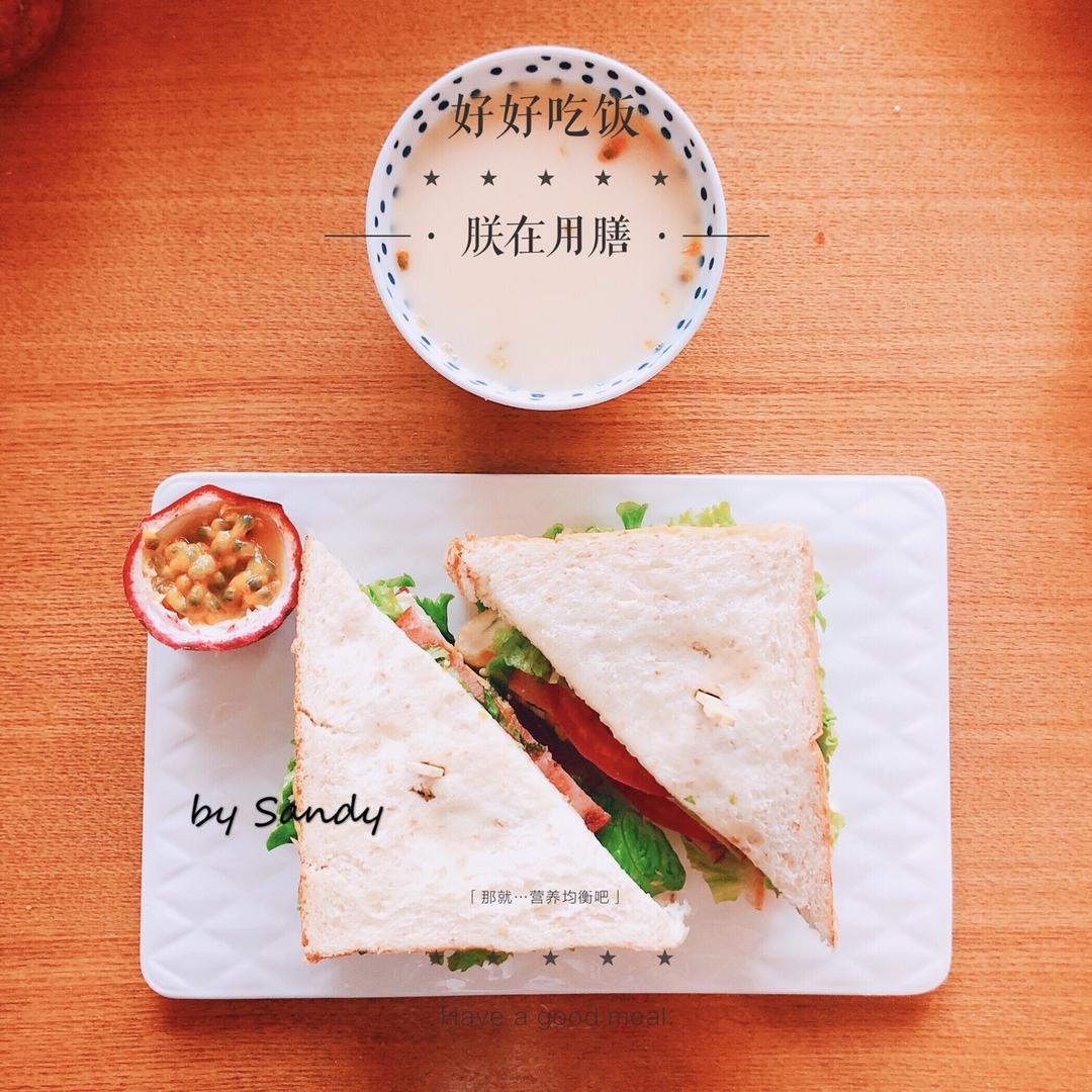 #健身食谱#三明治:全麦面包,火腿,生菜,西红柿,百香果养乐多