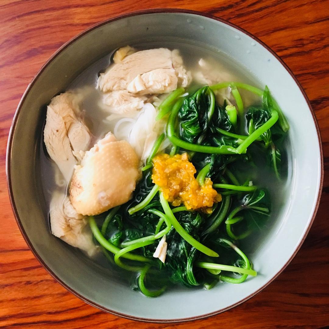 下班了懒得去打包,用昨晚做的盐焗🐔,配点红薯叶,一碗清淡的鸡肉米粉就做好啦!吃完后还吃了半个昨天做的奥利奥蛋糕🍰,太好吃...