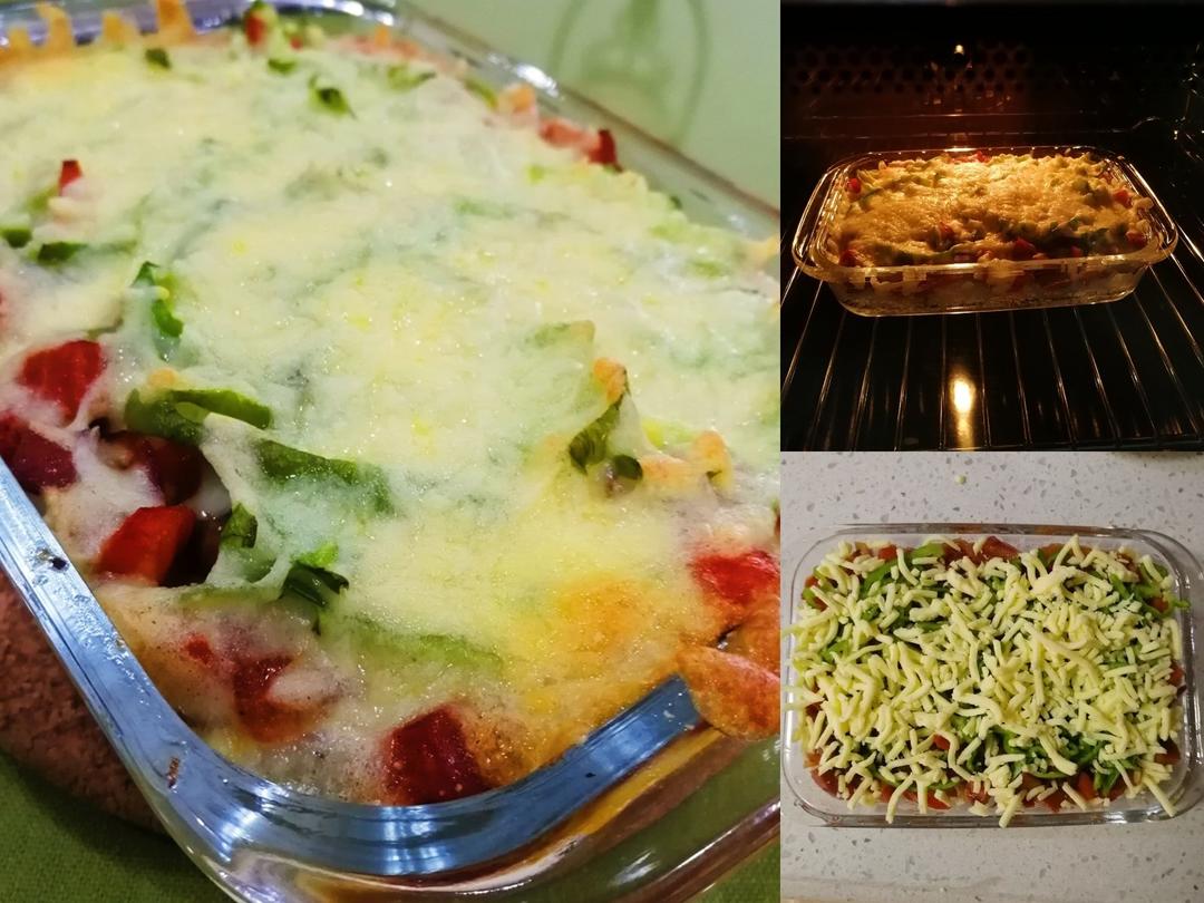 第一次做焗饭,哈哈哈,还不错!不过下次温度应该再高一点,表面没有烤金黄。