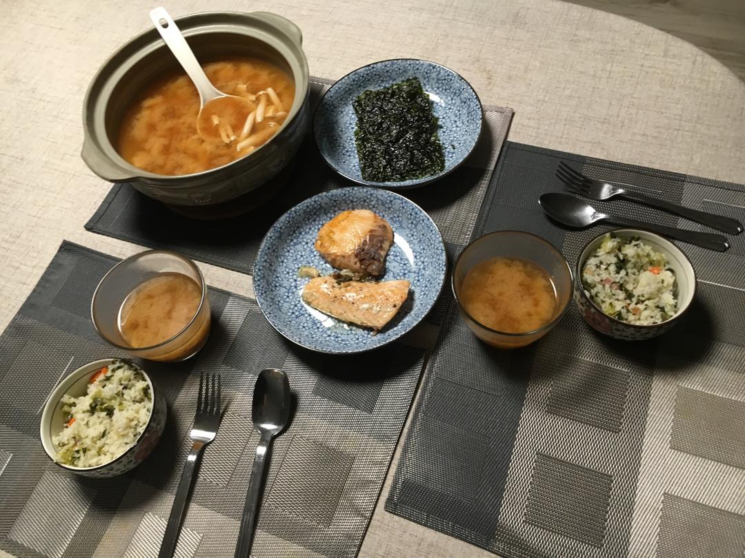 今晚的晚餐简单又好吃:上海菜饭,味增汤,煎三文鱼。