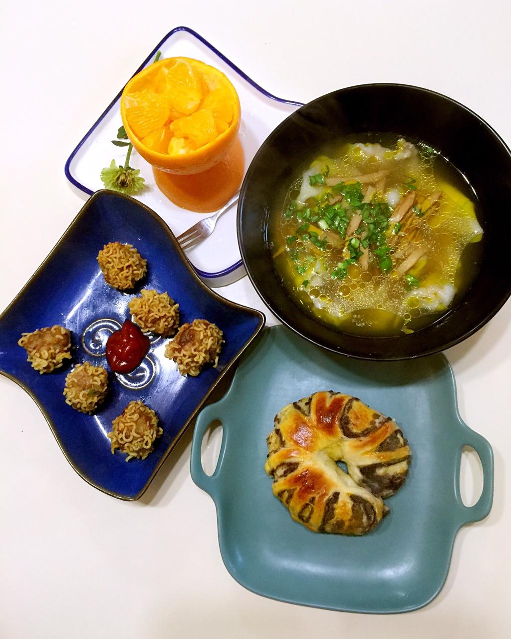 鸡汤小馄饨,豆沙面包,炸丸子