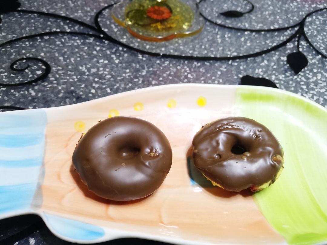 老公给儿子做的甜甜圈,加了草莓粒和蓝莓粒,巧克力是德芙,味道好的很