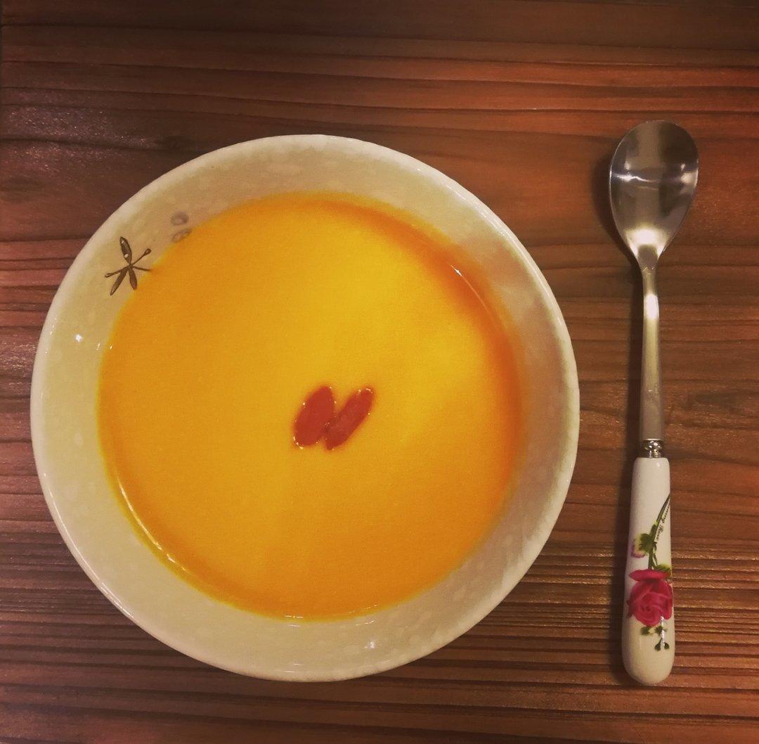 奶油南瓜汤:南瓜200g(蒸熟、软),纯牛奶100g,淡奶油20g(没有就不加),糖10g...
