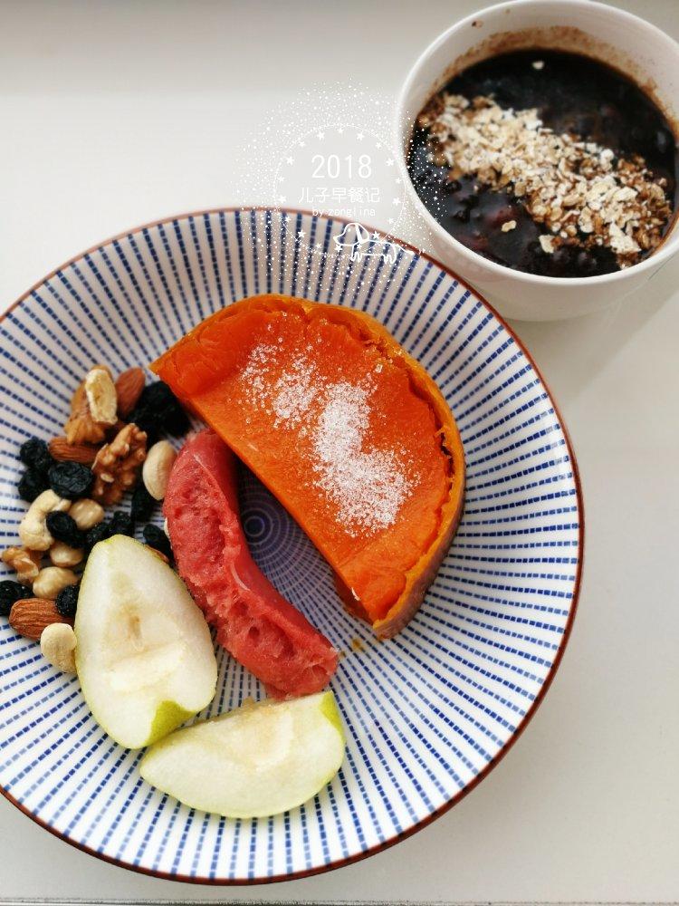 红豆沙甜汤配麦片,蒸南瓜和香肠,每日坚果,香梨
