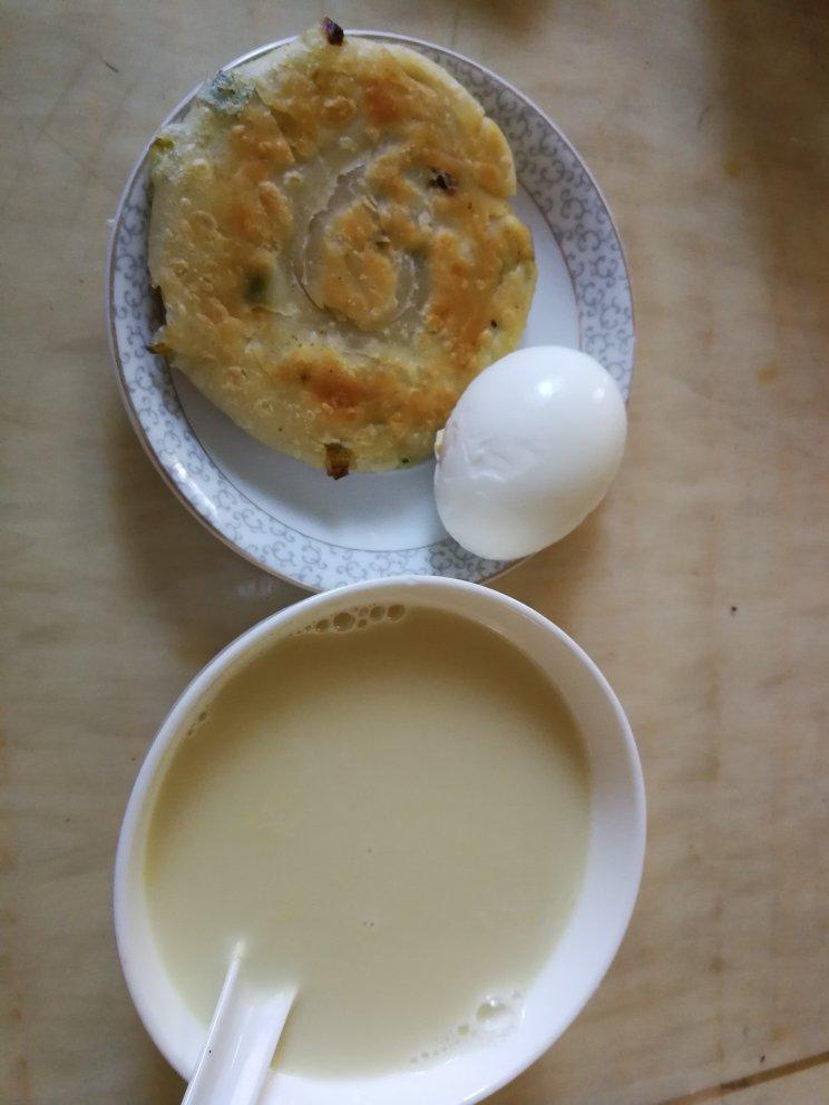 葱油饼+豆浆+白煮鸡蛋