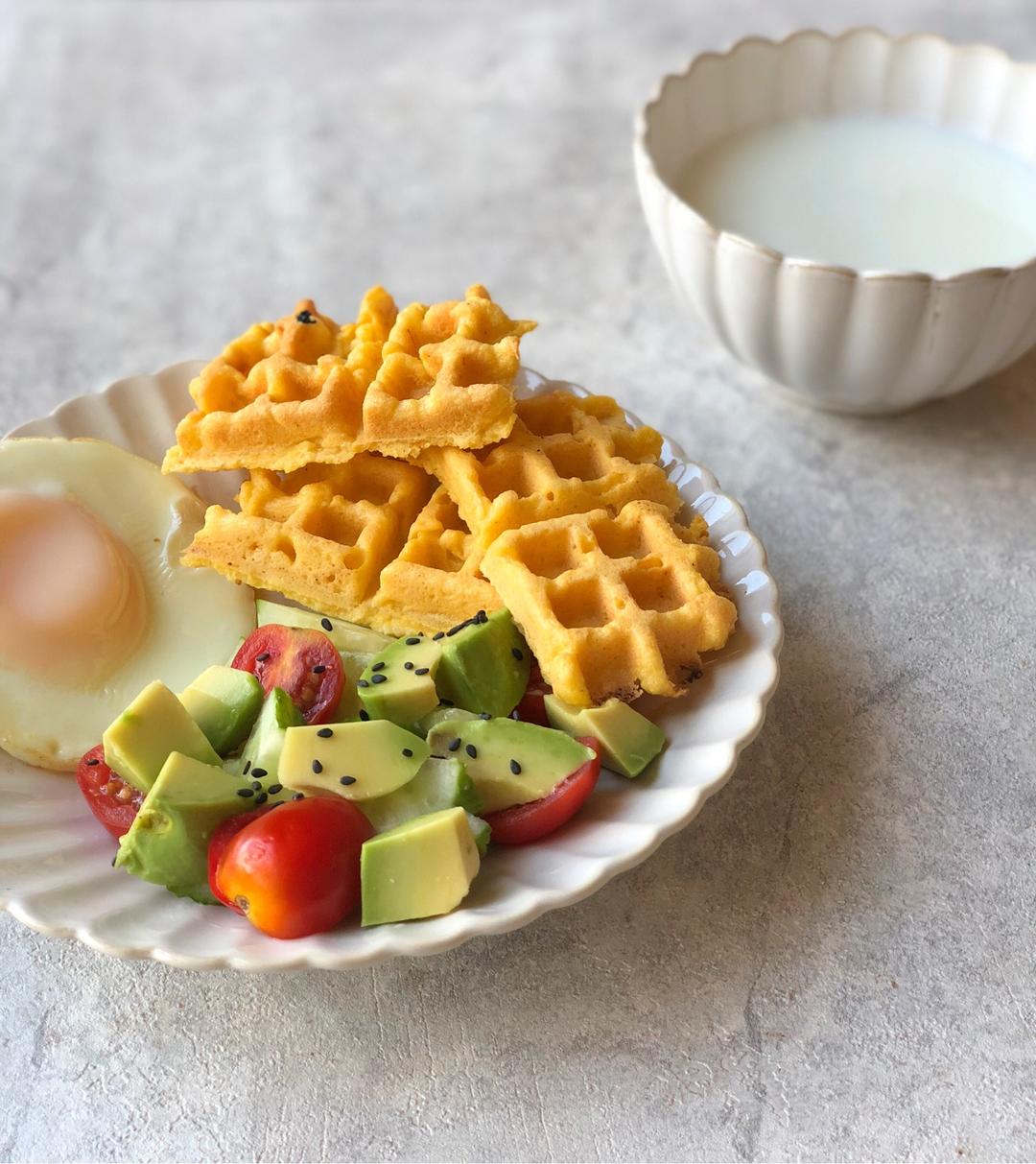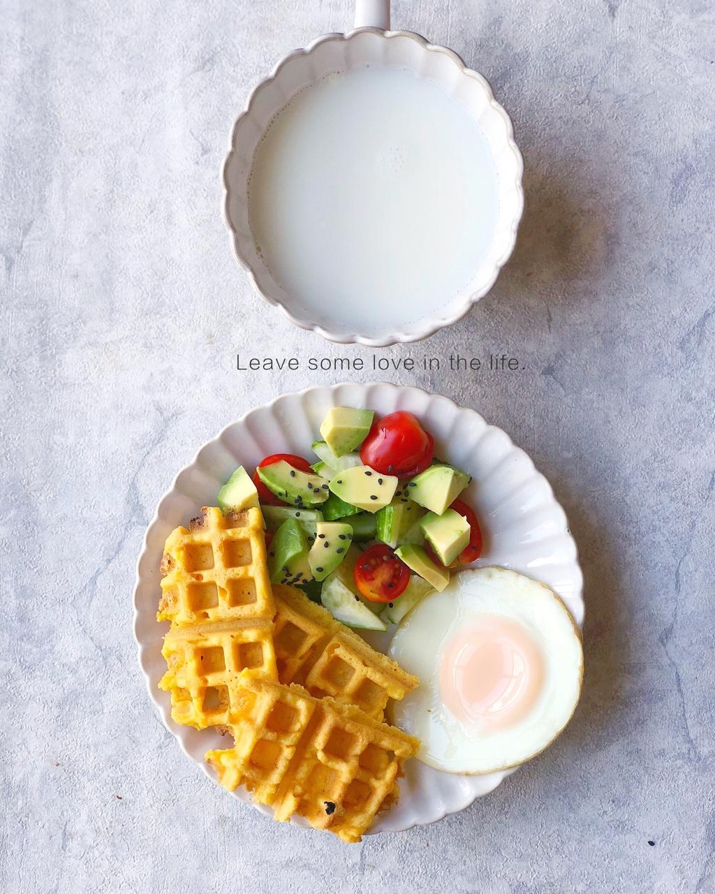 今日早餐:玉米🌽饼、牛油果🥑黄瓜🥒沙拉🥗、煎蛋🍳、牛奶🥛