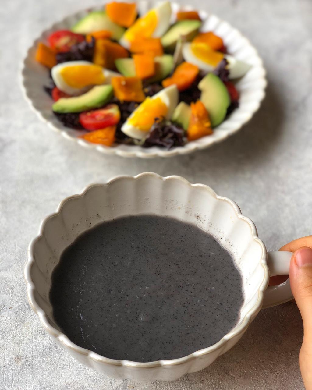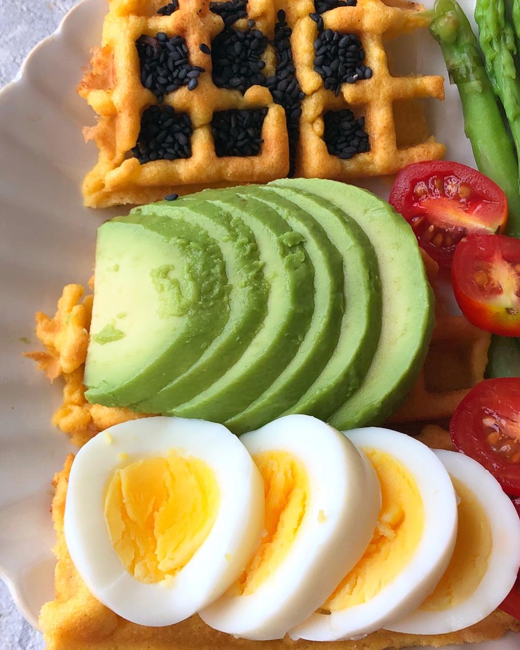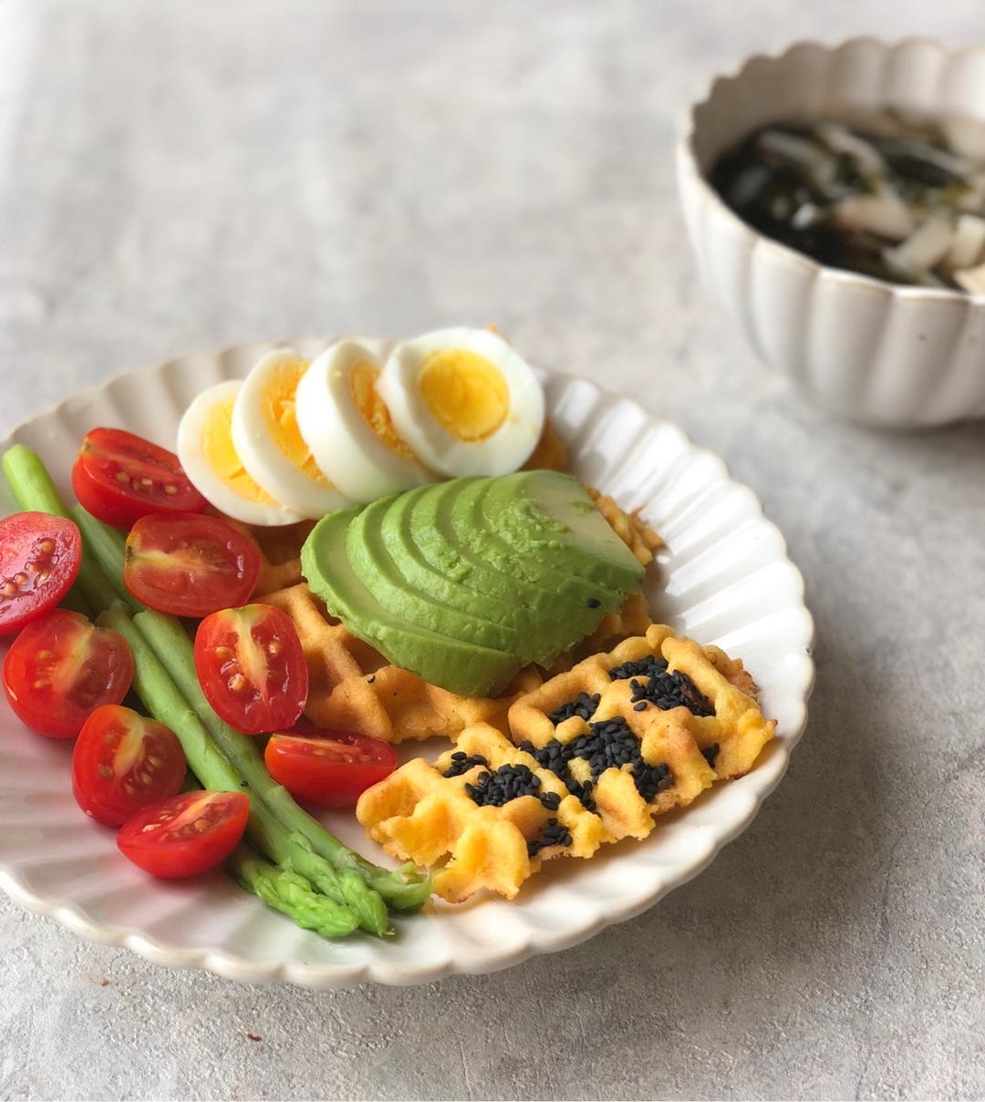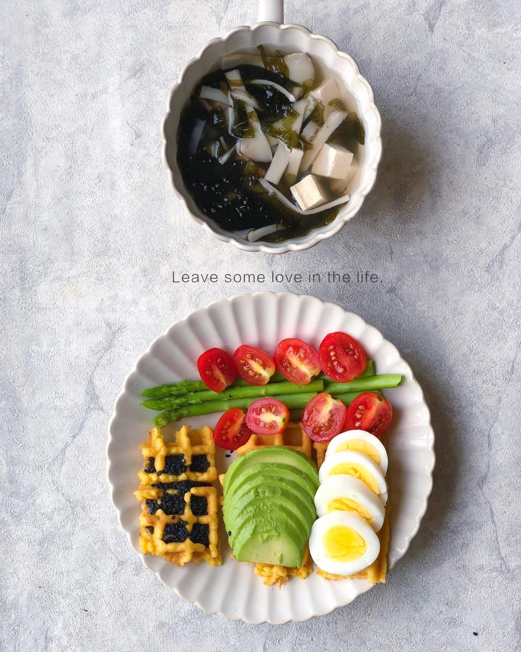 今日早餐:三种口味玉米🌽饼(黑芝麻、牛油果🥑、鸡蛋)、豆腐菌菇紫菜汤🥣、芦笋&小番茄🍅