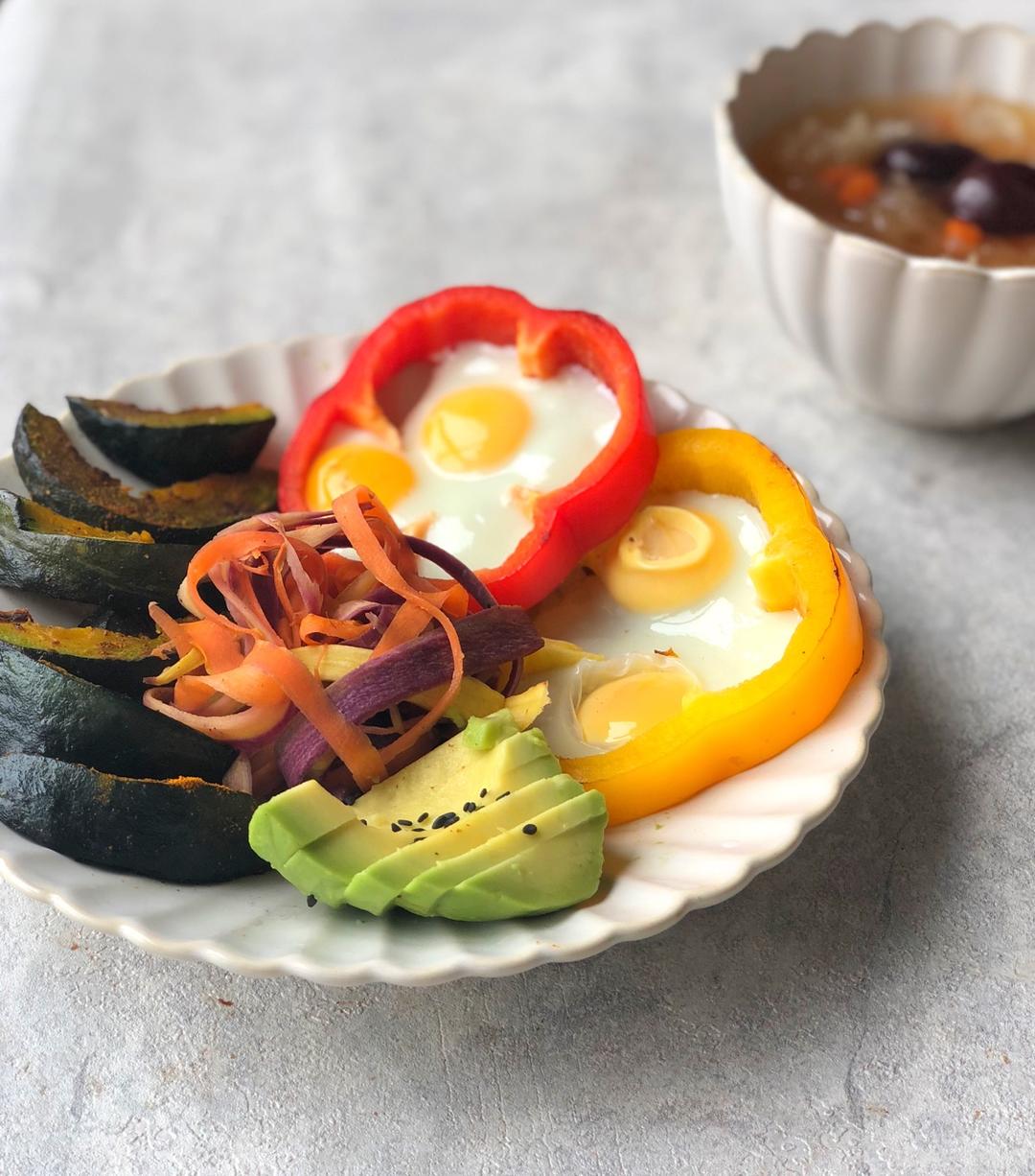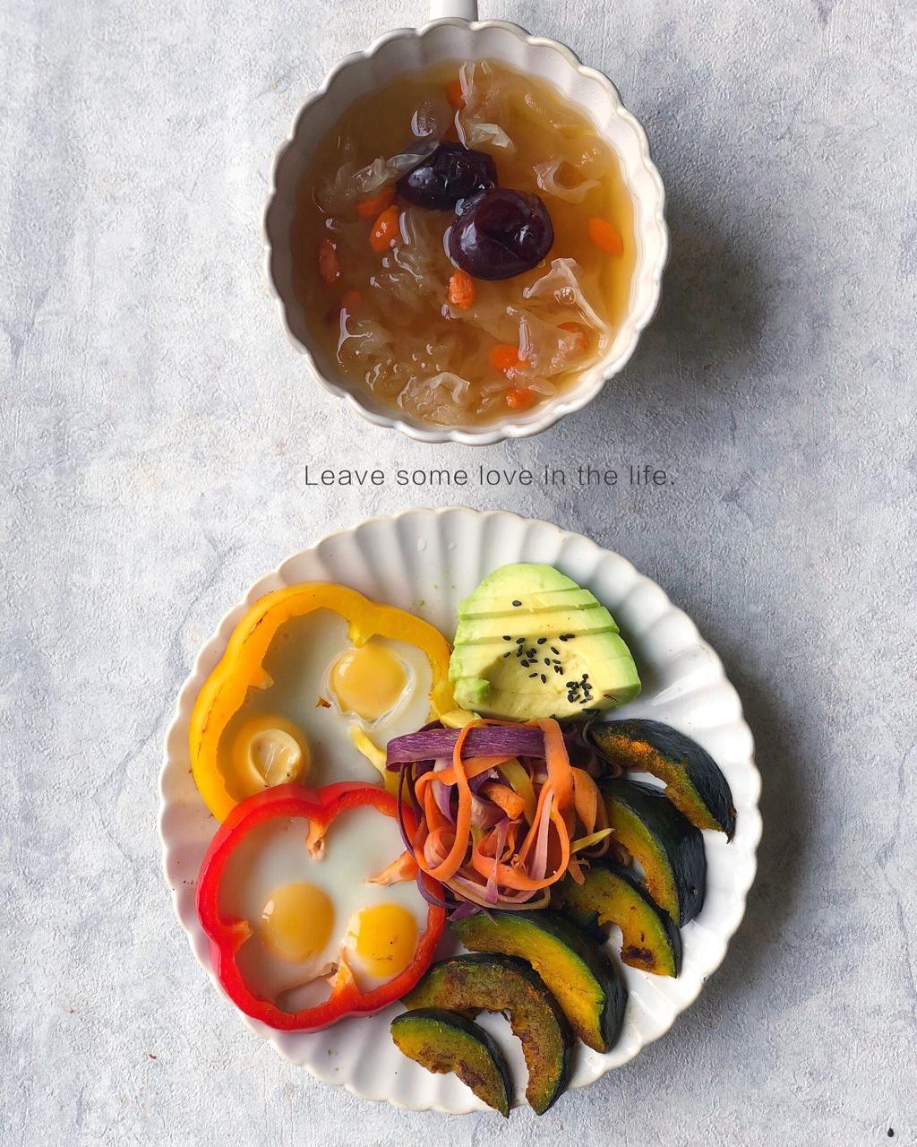 今日早餐:银耳桃胶红枣汤、贝贝南瓜🎃、鹌鹑蛋彩椒圈、炒萝卜丝、牛油果🥑