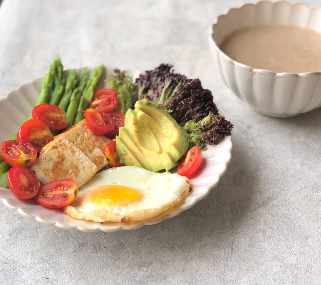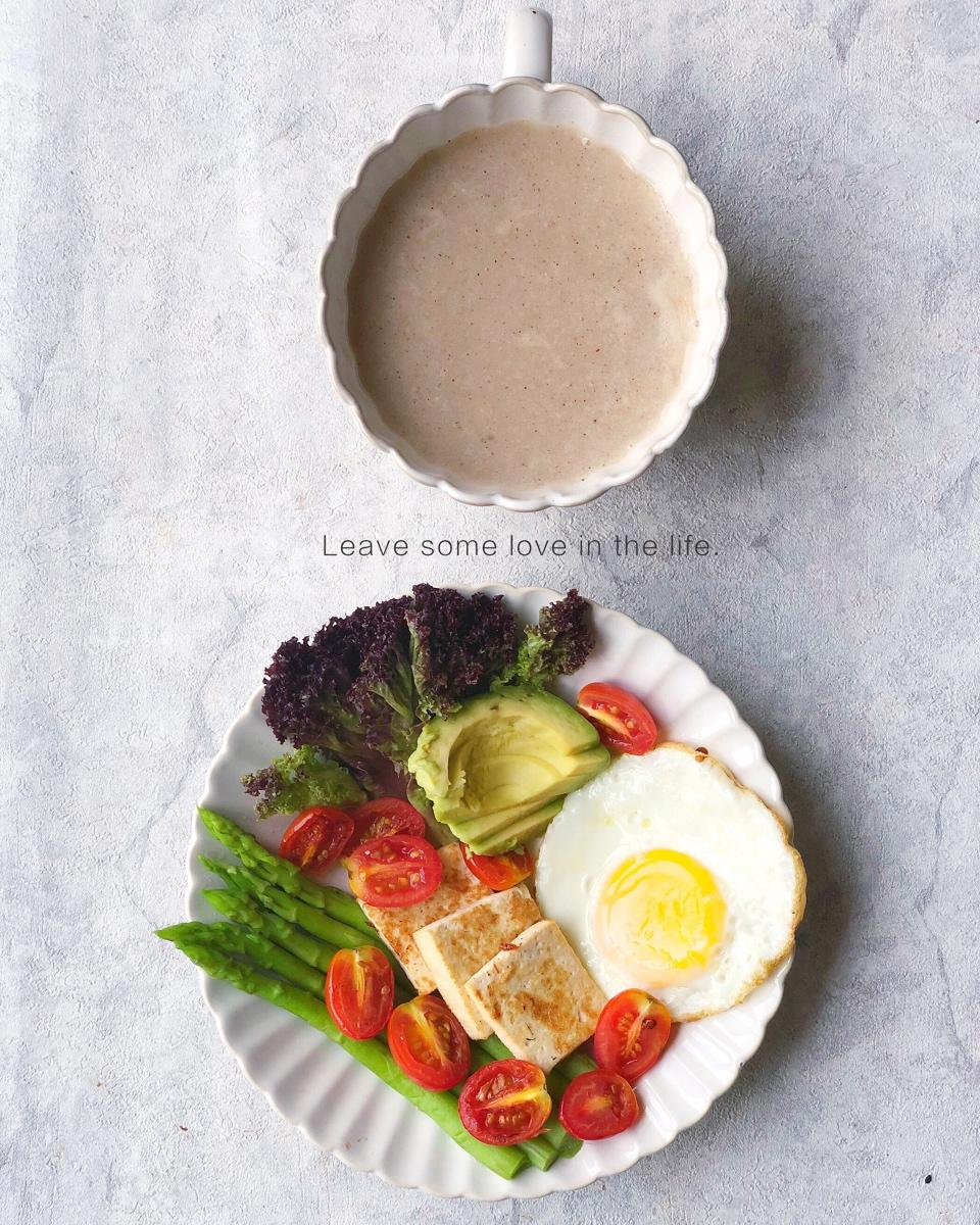 今日早餐:燕麦糯米红枣饮、煎蛋🍳、煎豆腐、芦笋&小番茄🍅&...