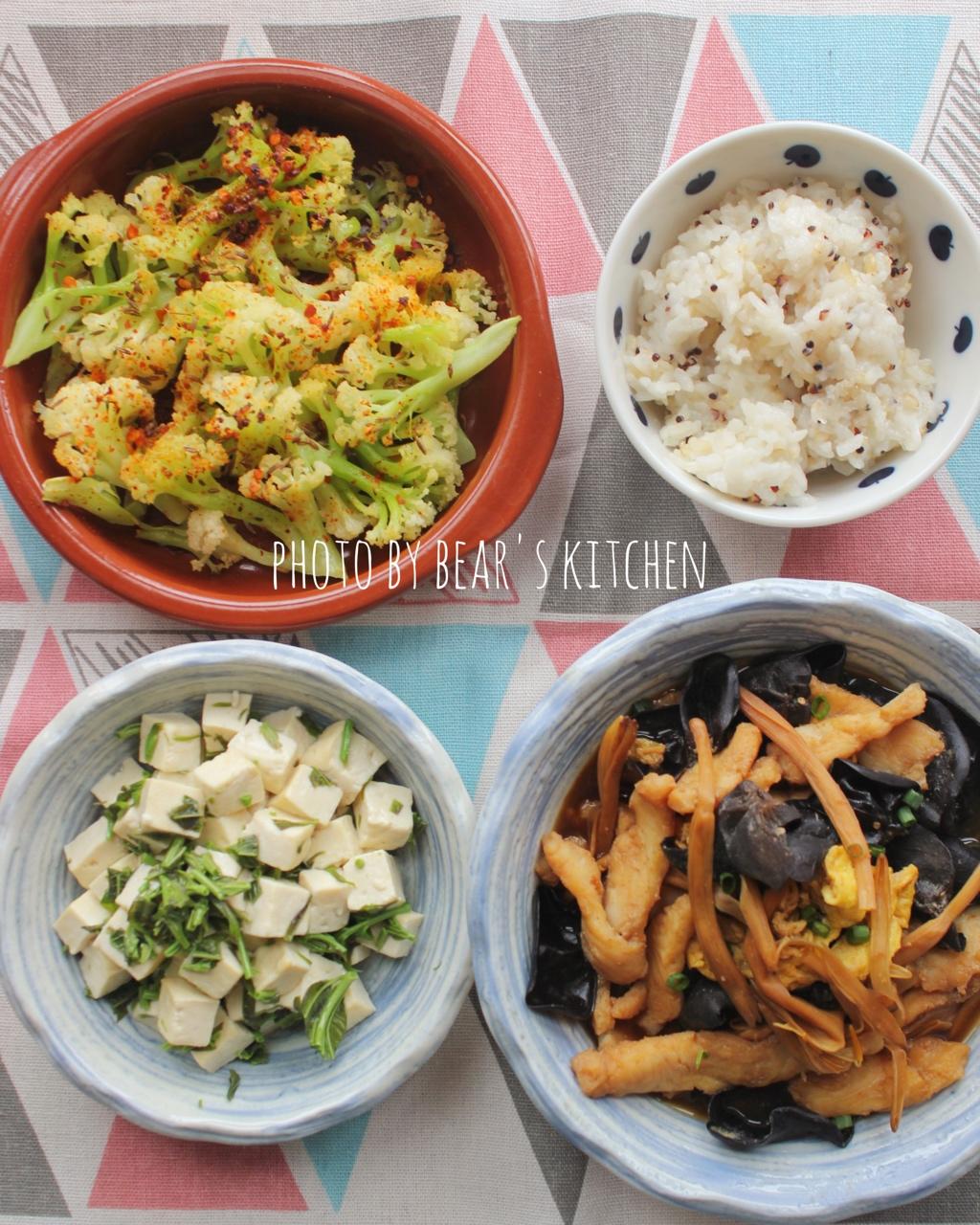 烤花菜、香椿豆腐、苜蓿鱼