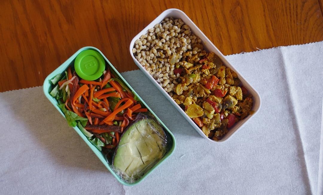 鹰嘴豆炒豆腐 发芽小麦饭 生菜胡萝卜 hummus 牛油果
