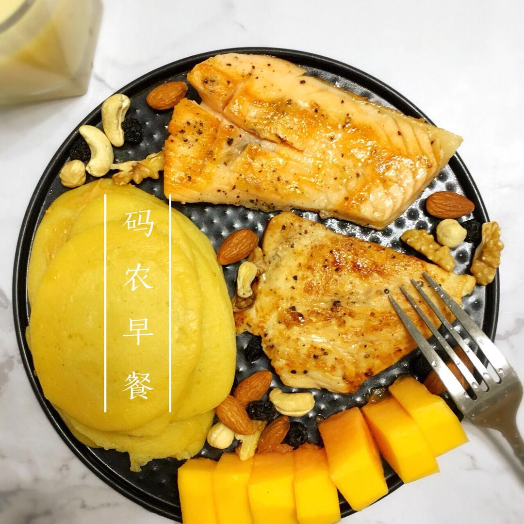 今日早餐食材:花生酱松饼➕三文鱼➕香煎鸡胸肉➕木瓜➕每日坚果➕莲子鹰嘴豆汁,满满自然力。