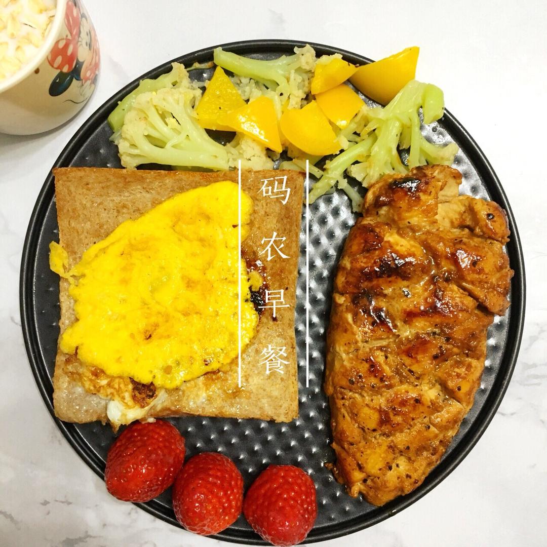 今天早餐:🍞全麦吐司➕🐔橙香鸡胸肉➕🥚蛋➕🥦花菜➕黄椒➕牛奶燕麦➕🍓草莓