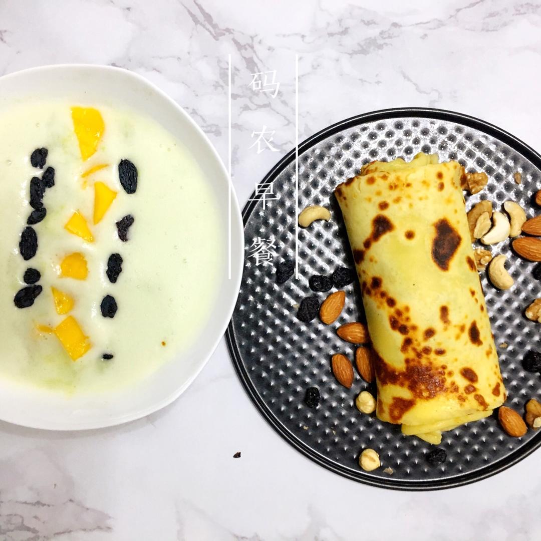 今日早餐:鸡蛋牛奶奥利奥黄油卷饼➕黑加仑干芒果白菜芦笋鹰嘴豆黄豆奶昔➕每日坚果