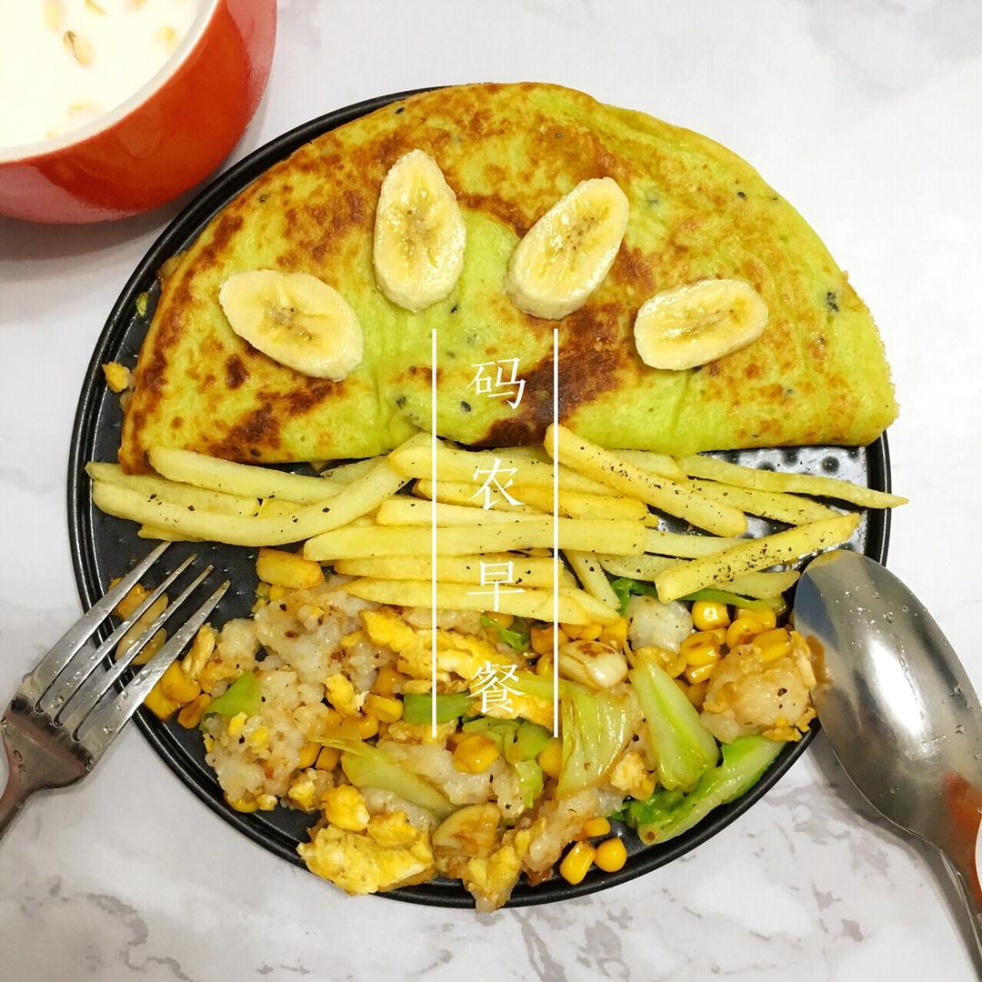 今日早餐:芦笋白菜山药牛奶蛋饼➕美薯条➕玉米白菜蛋炒饭➕燕麦牛奶
