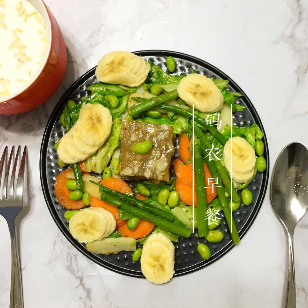 食材:香煎马蹄糕➕白菜➕胡萝卜➕芦笋➕香蕉➕黑加仑干燕麦牛奶