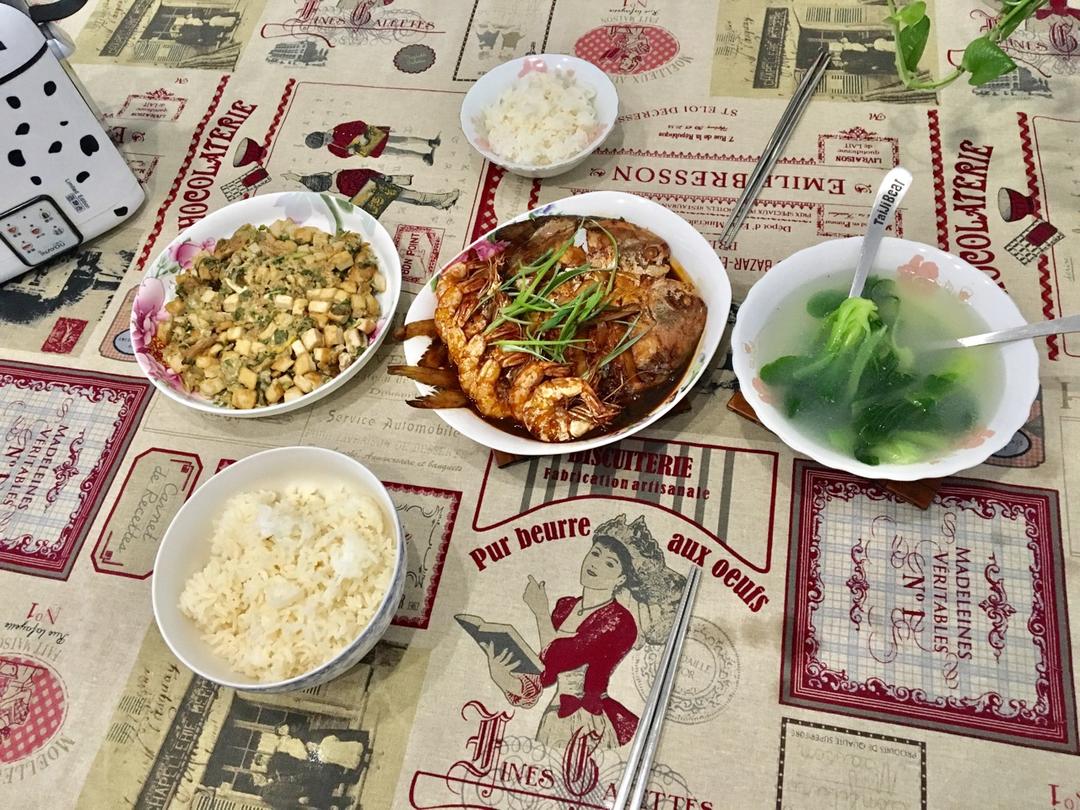 今天的午餐:红烧鲳鱼+虾、鸡蛋炒豆腐香椿芽&排骨汤油菜&米饭🍚