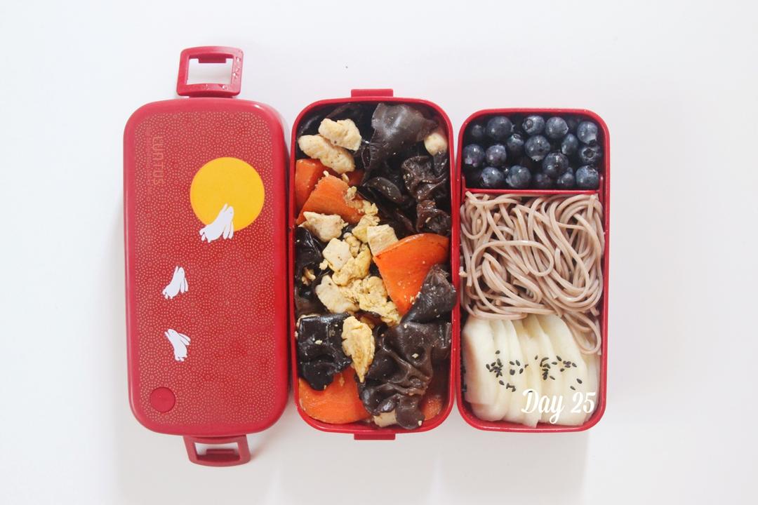 今日份:黑木耳胡萝卜炒鸡蛋鸡胸肉,水煮茭白,荞麦面,蓝莓。