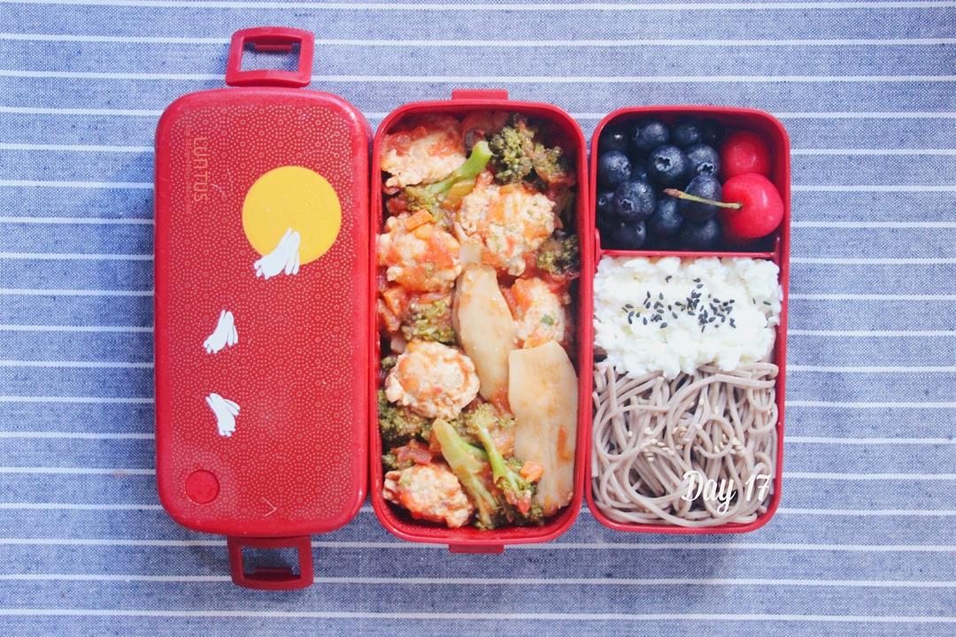 今日份:番茄西兰花炒鸡胸肉丸子,荞麦面,清炒鸡蛋白,蓝莓,樱桃。