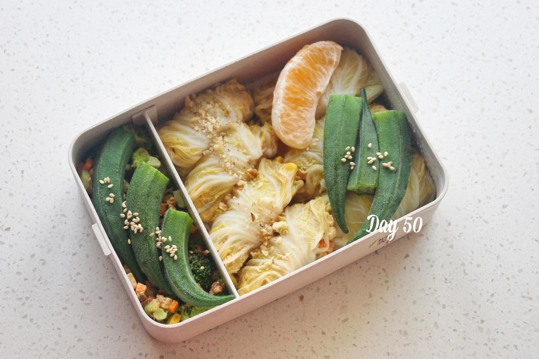 白菜雞胸肉卷、水煮秋葵、雞胸肉炒雜蔬、橙子