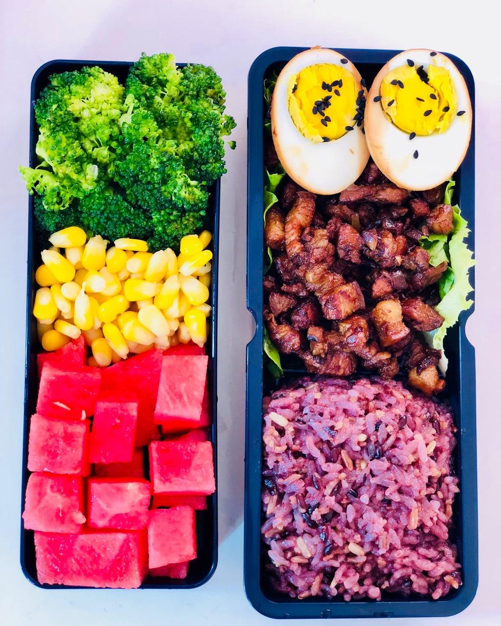 台式卤肉饭;杂粮米;卤蛋;水煮西兰花,玉米粒,西瓜