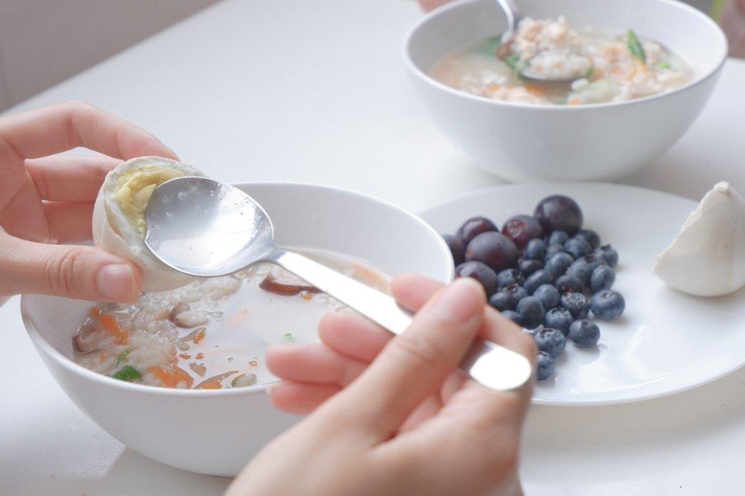 香菇鸡肉粥和爸爸腌的咸鹅蛋~