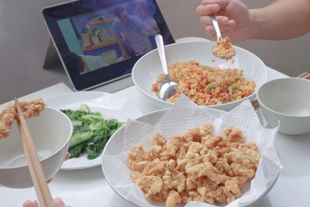 现炸小酥肉配蛋炒饭,清炒小白菜~