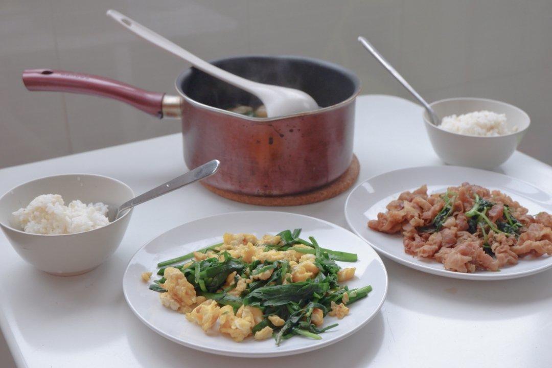 韭菜鸡蛋,龙利鱼丸子汤,孜然羊肉