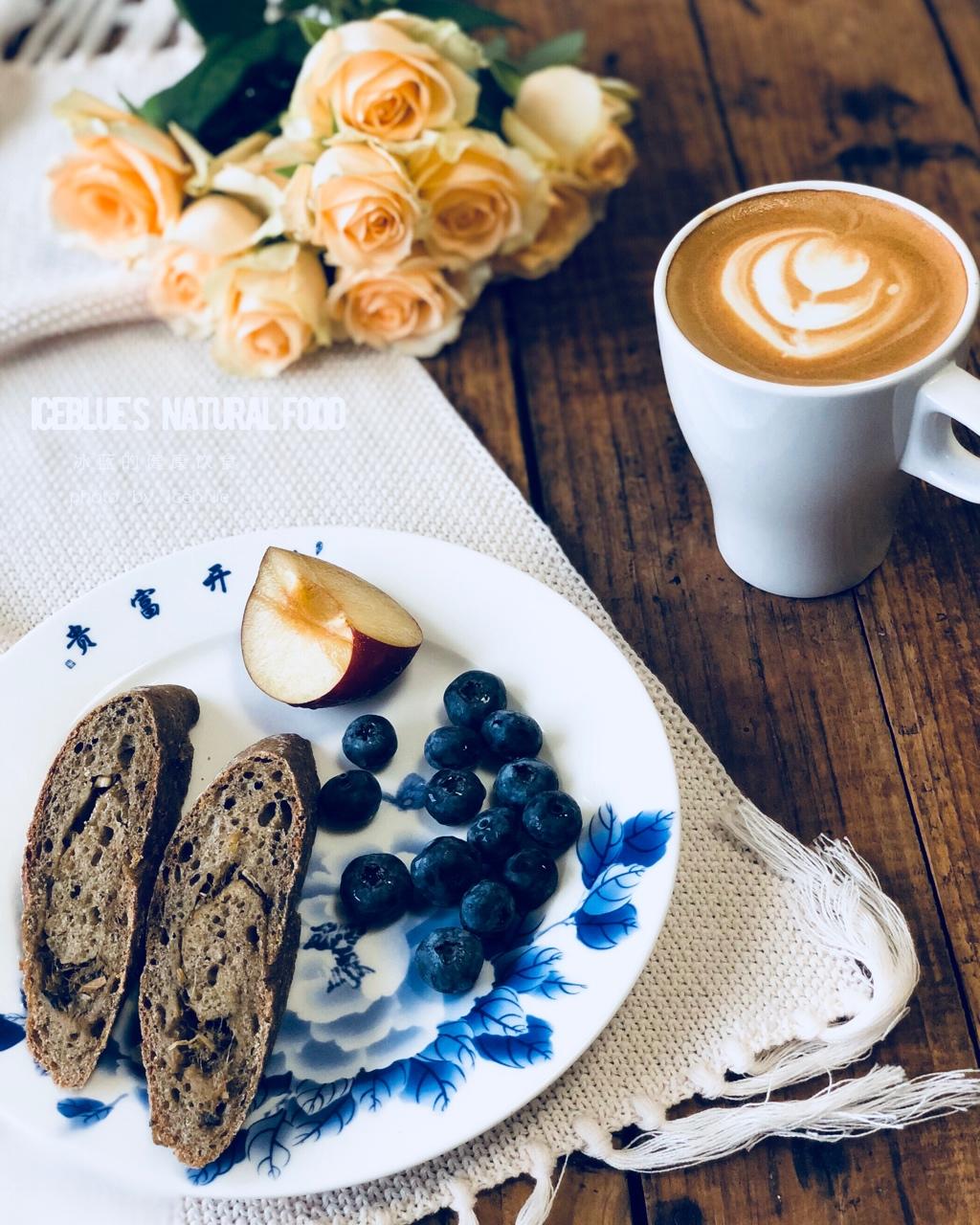 霉干菜欧包,水果,拿铁咖啡