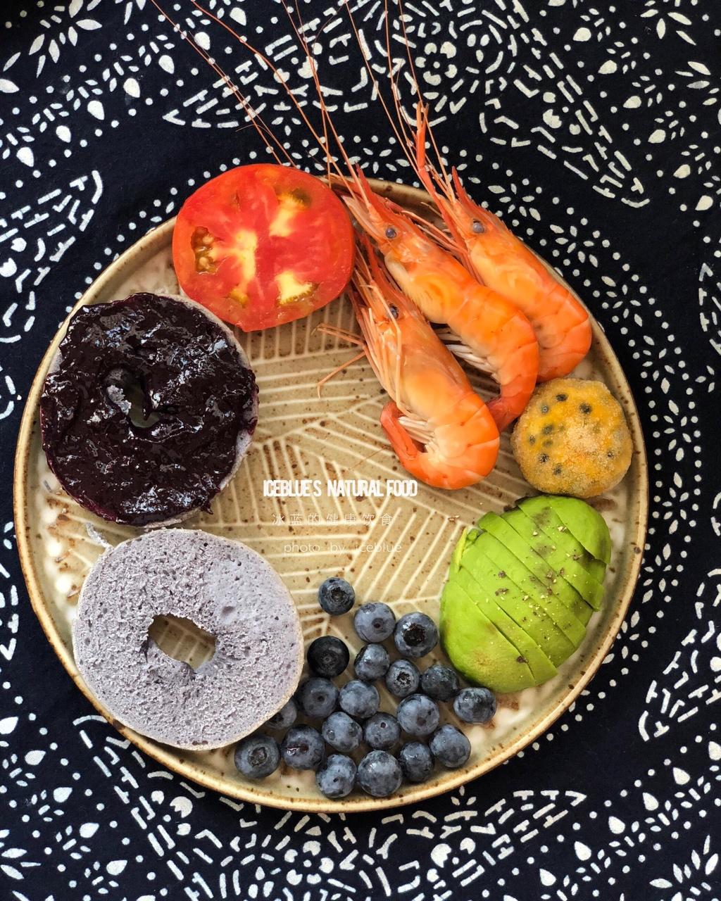 蝶豆花贝果,配合七彩主题,一早上菜场釆买大虾及水果。红的蕃茄,橙色大虾,黄色冻百香果,绿色牛油果,靓色蓝莓,蓝色贝果,紫...