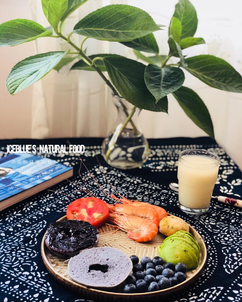 蝶豆花贝果,配合七彩主题,一早上菜场釆买大虾及水果。红的蕃茄,橙色大虾,黄色冻百香果,绿色牛油果,靛色蓝莓,蓝色贝果,紫...
