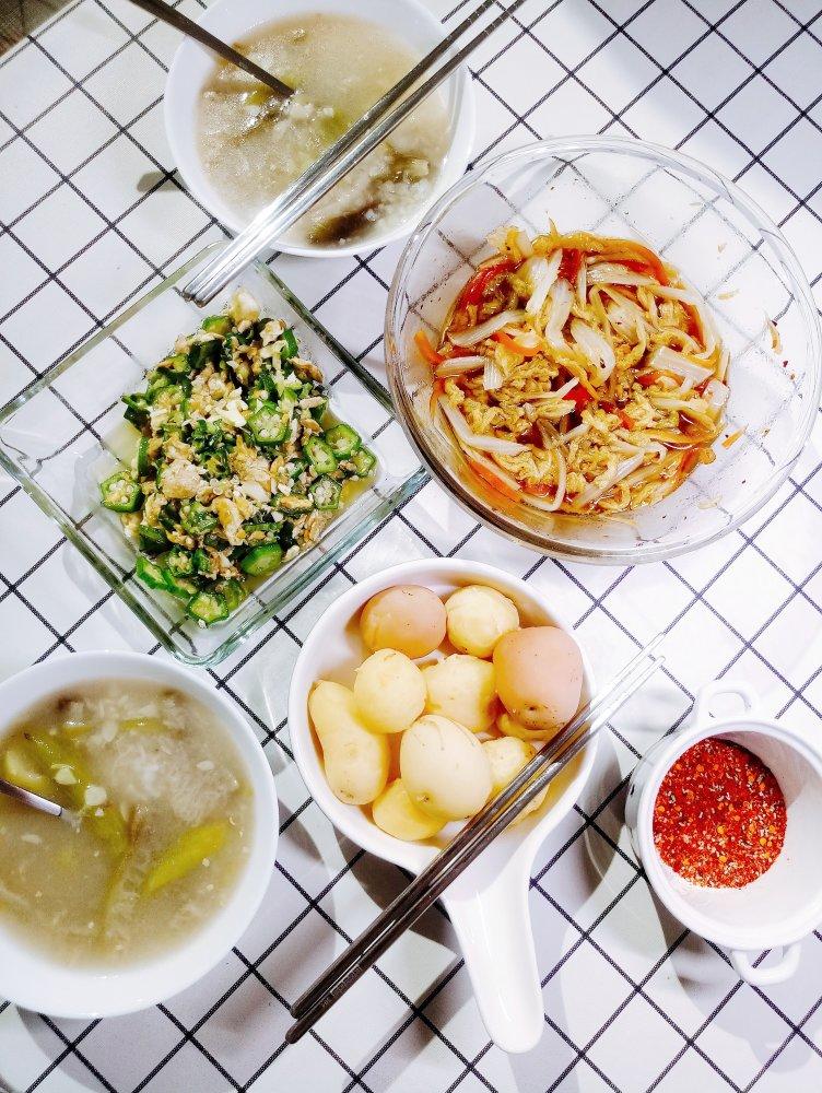 【2018.6.30-晚餐】丝瓜炖饭,蒸娃娃菜胡萝卜,蒸高山小土豆,秋葵炒鸡蛋