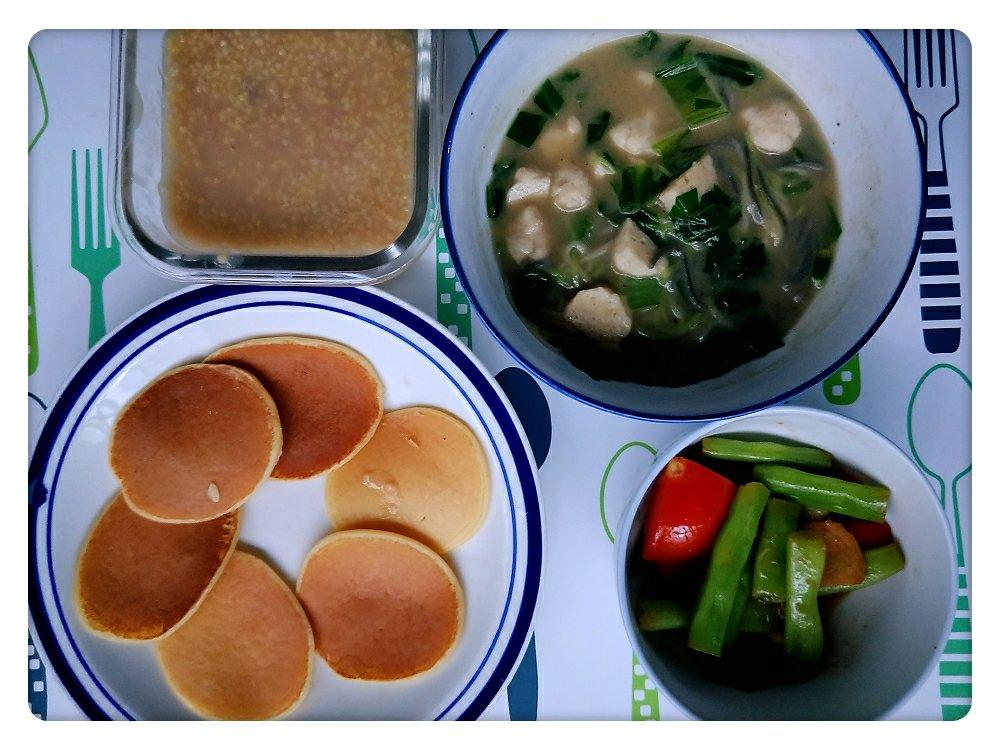 红枣小米粥+香蕉松饼+鸡丸菜汤+番茄炒豆角