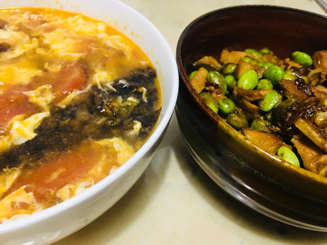 番茄青椒炒蛋和炖豆角 赶着做俩菜 没摆盘是不是看着没食欲哈哈哈哈 起...