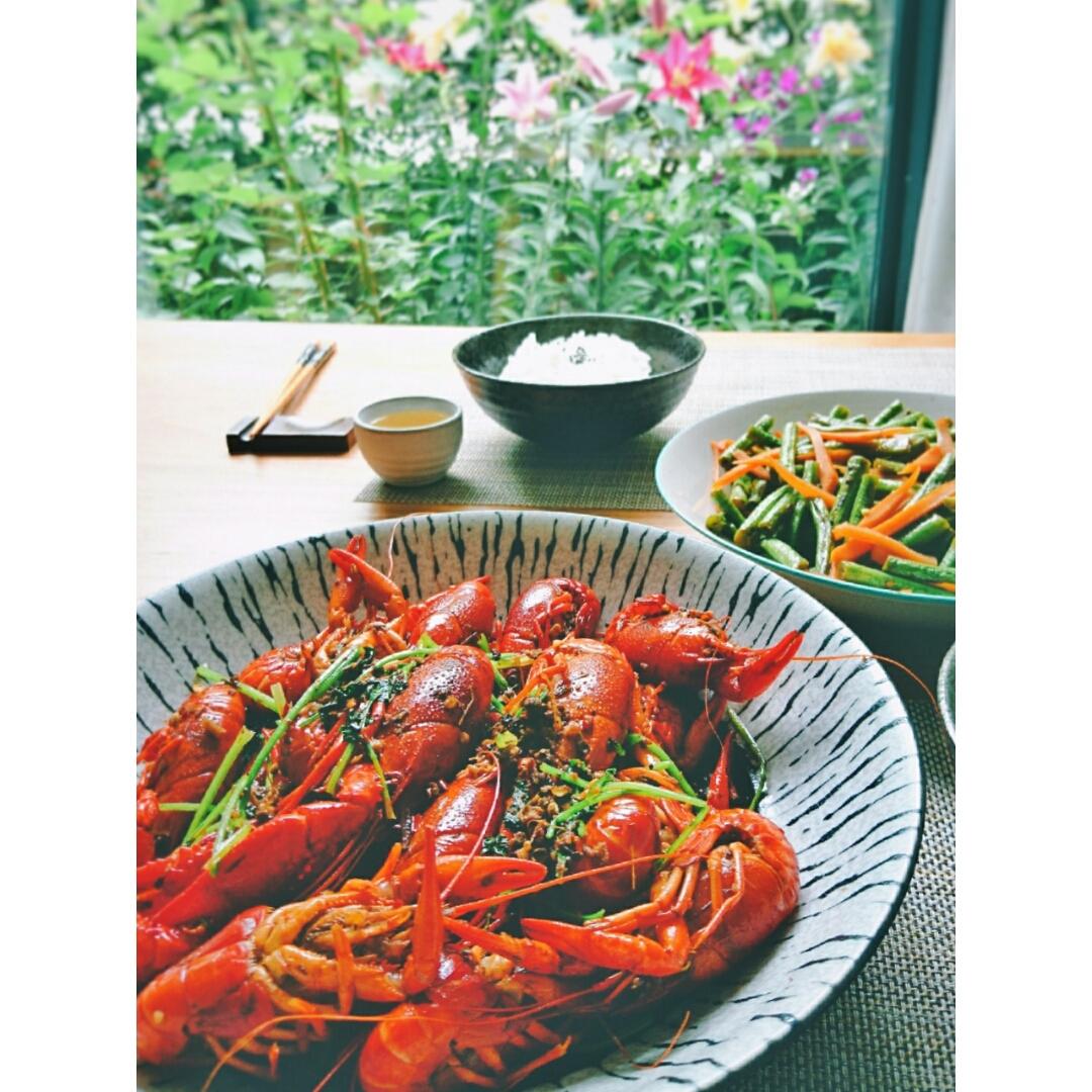 昨天的午饭。买的沃尔玛熟的盒装小龙虾(十三香味)、胡萝卜炒豇豆