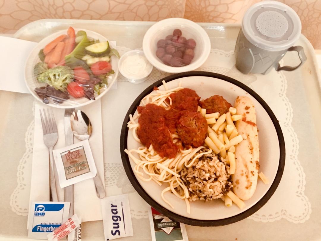 出院前的最后一顿饭,meatball spaghetti, rice pilaf, garlic bread, gard...
