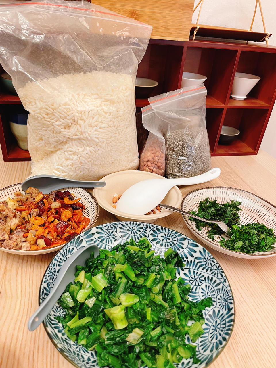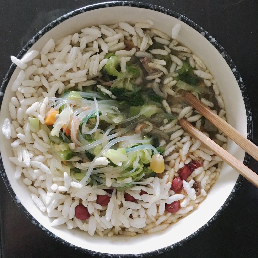 用大骨加薏仁、小麦和花生米熬成的高汤,菜料里是菠菜、生菜、粉丝、腊肉、鱿鱼条、香菇、小虾...