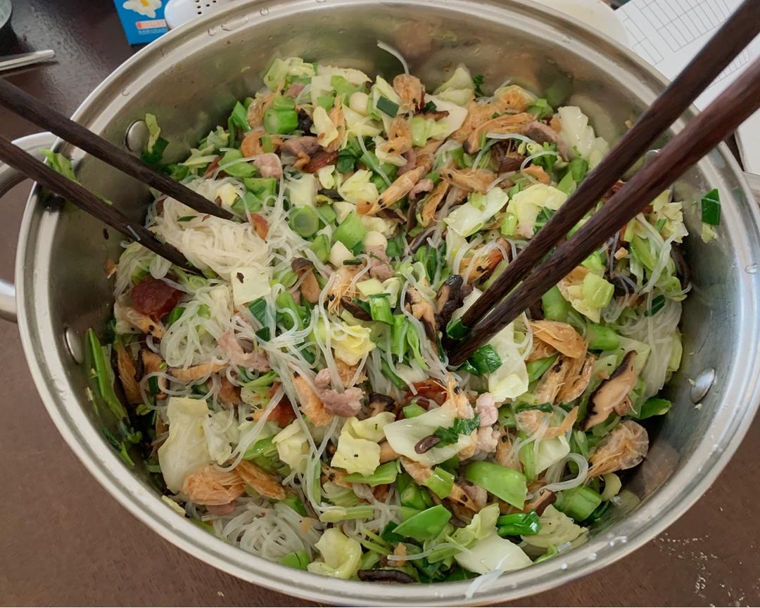 材料:荷兰豆 菠菜 包菜 粉丝 猪肉 腊肠 香菇 鱿鱼干剪条状 虾仁 (喜欢什么都可下),分别炒熟然后...