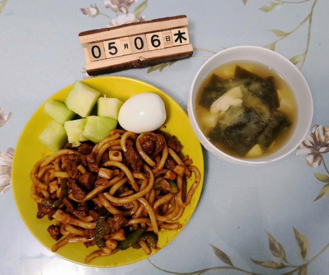 杏鲍菇黑椒牛肉炒乌冬,味增汤!!!
