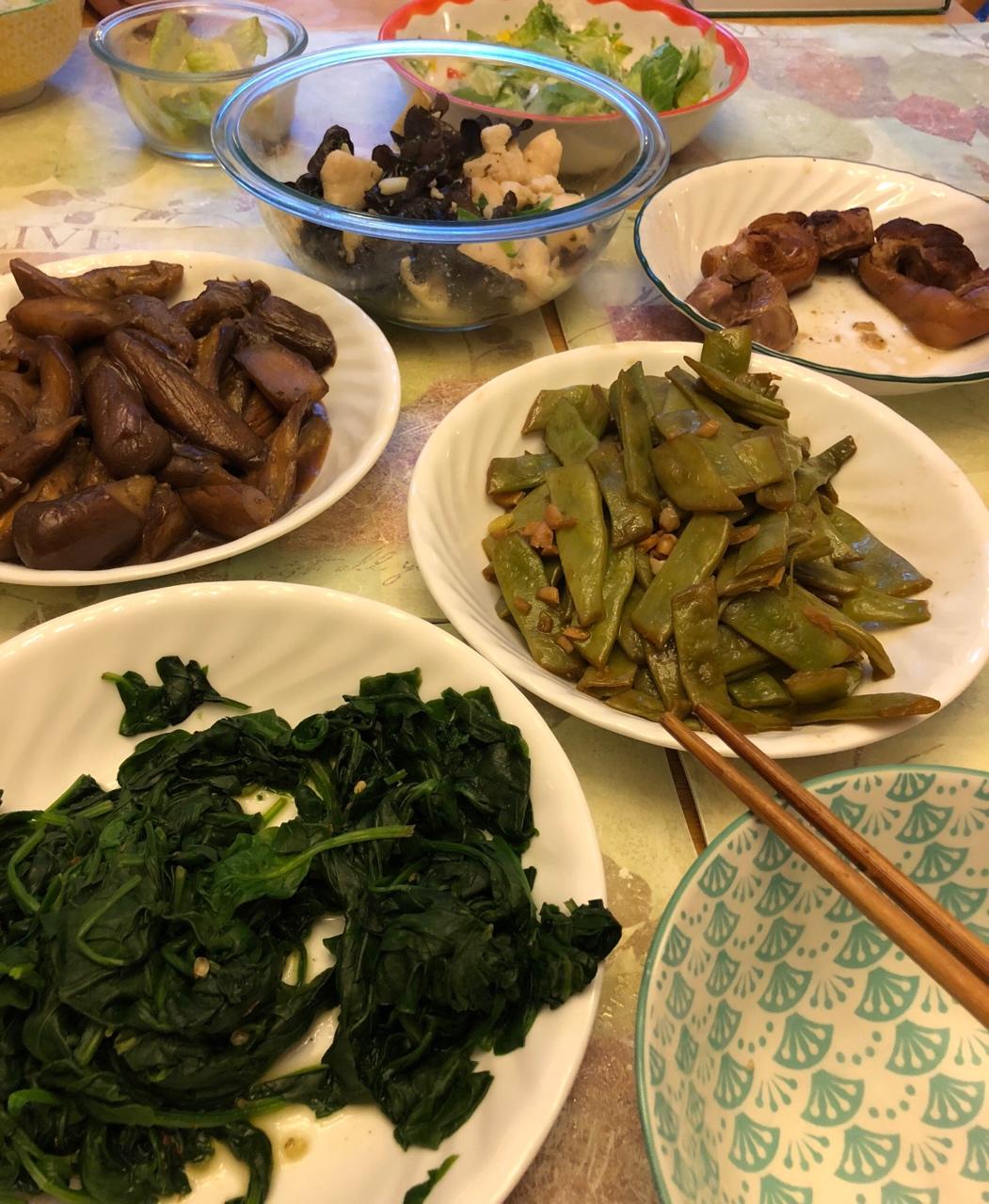猪肘子,木耳鱼块,茄子,豆角,菠菜,米饭……