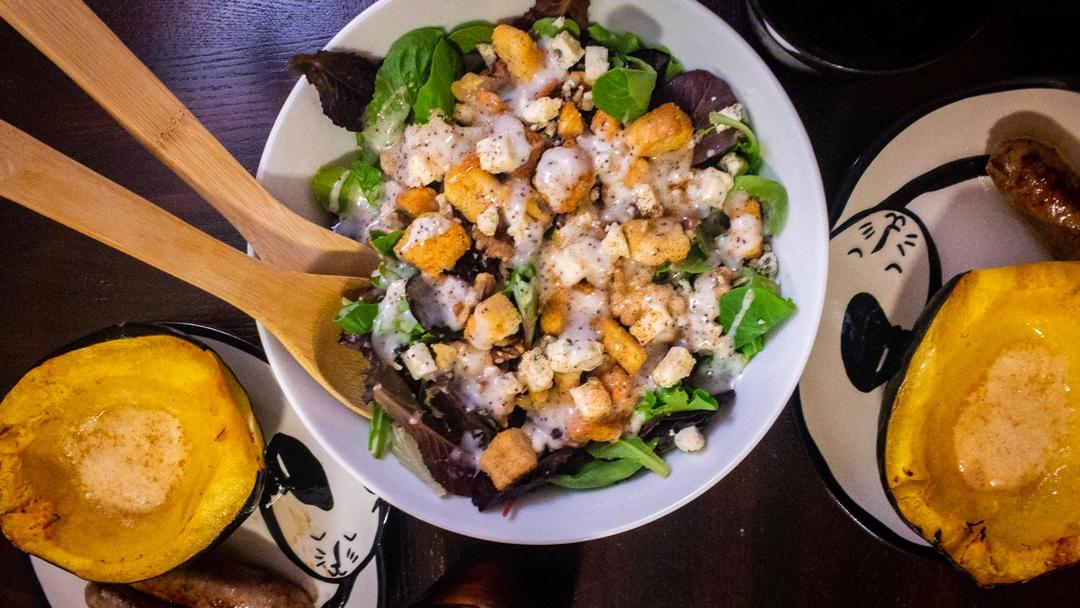 杂蔬核桃色拉 烤小青南瓜和煎意大利猪肉肠